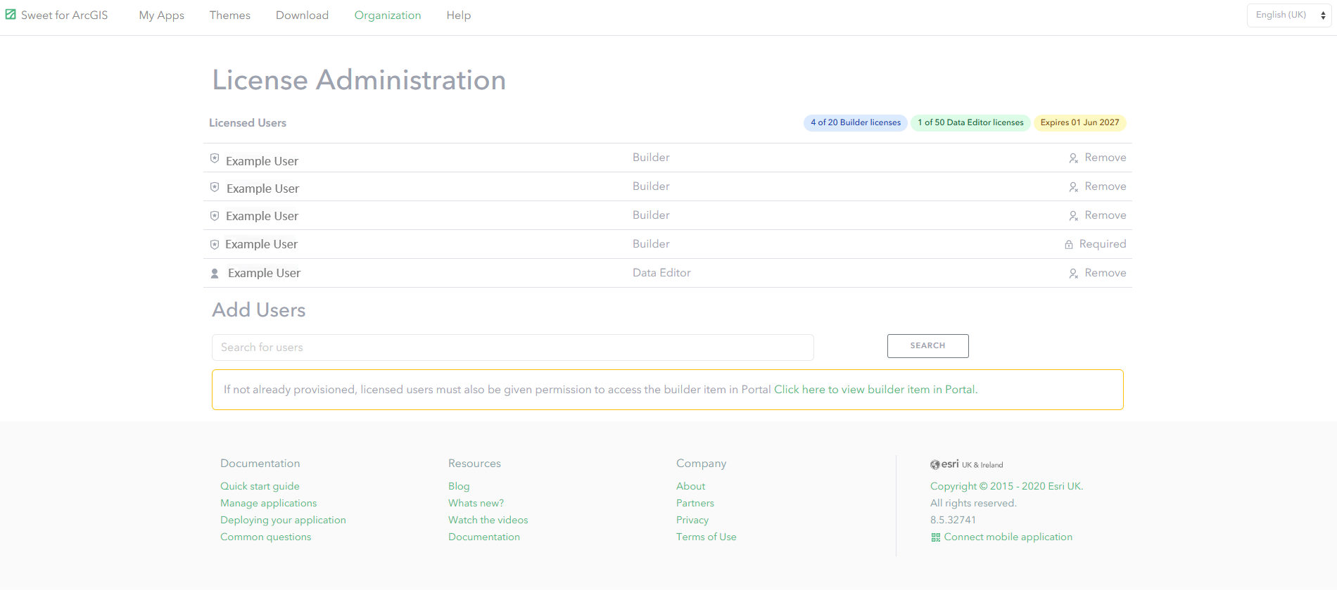 After the licence has been installed and the portal groups created you can allocate the individual user licences. Please note that the owner of the Sweet portal item will automatically be allocated one user licence. To allocate user licences: