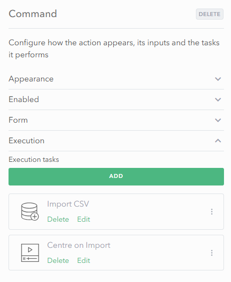 6. To centre the map on the imported features, one could create another Execution task with the Run Actions option with the following script noting that the order of Execution tasks in the Command panel needs to be followed.