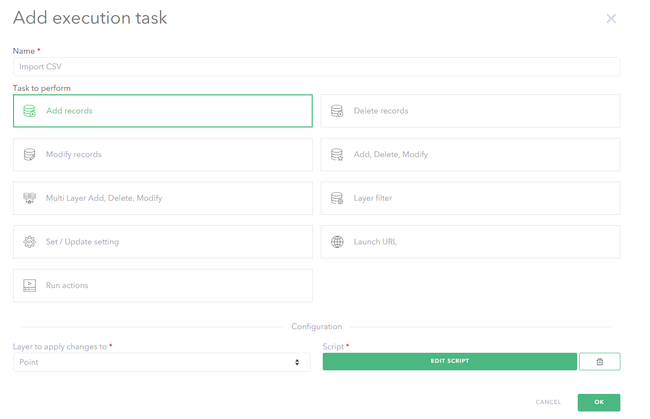 5. Execution tasks can be setup in the Command panel to perform actions upon uploading of a file. For example, it is possible to take an imported CSV file and convert it into a FeatureSet with the following Arcade script.