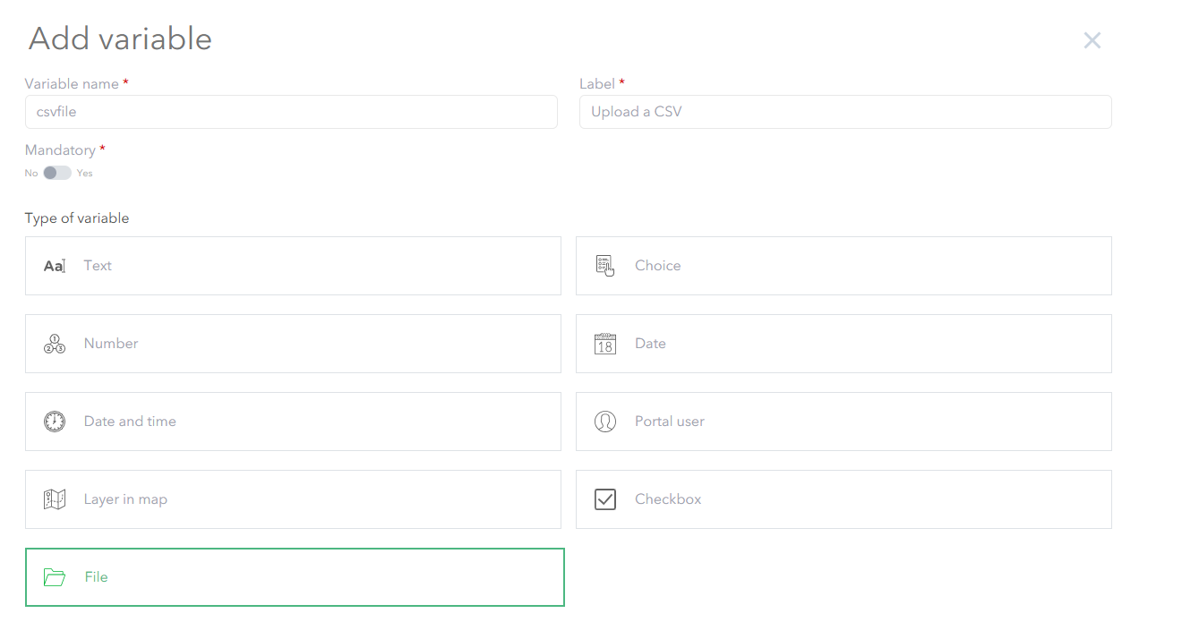 2. Add a Form parameter variable and set to File